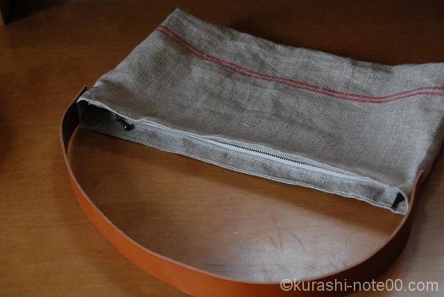 本当はもっと薄い革の取っ手をつけたかったのですが、持ち合わせがなく、ちょうどいい厚さの革も手に入らなかったので、手芸店においてあったバッグ用の革ベルトを購入して作ってみました。