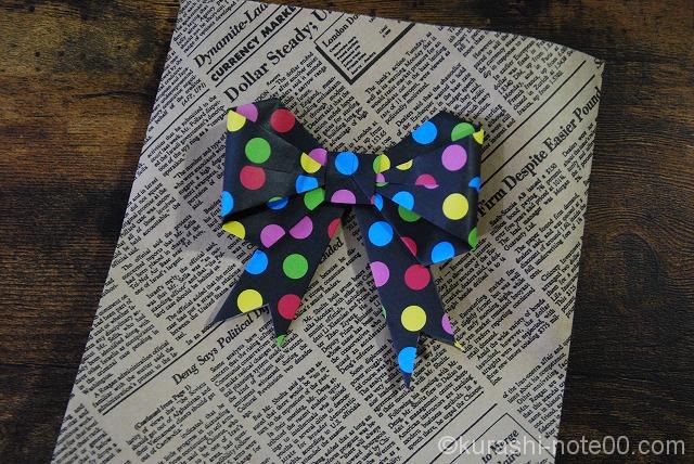 作る過程で真ん中を折り込むところが少し難しいですが、ここをクリアすると後はスイスイ折れます。はさみでカットするときは切り過ぎに注意しましょう。リボンの長さはお好みで。多少短くなっても愛嬌のある作品になりますよ。