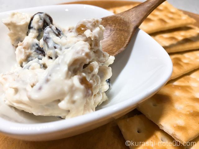 クラッカーは塩味が効いたものが合うような気がします。リッツは好きだけど、これの場合ちょっと違うかな…。そう思ったのでナビスコのプレミアムクラッカーをチョイスしました。これ正解でした!