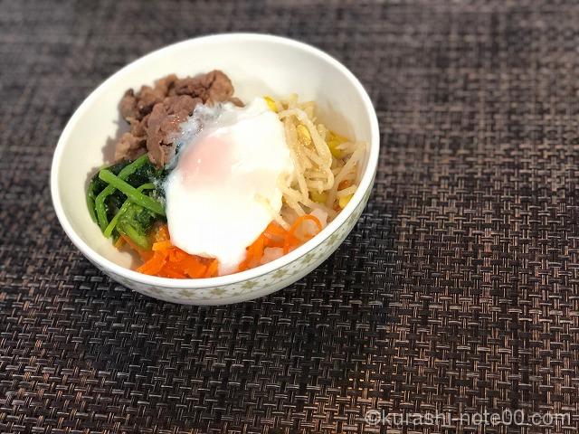 器にご飯を盛り、ナムルと牛肉をトッピング。ここではトッピングし忘れましたが、キムチを乗せてもおいしい。温泉卵を割り入れてできあがり。