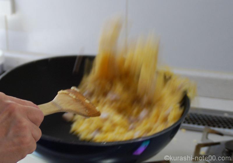 フライパンを振ることによって食材の上下が入れ替わり、油や調味料がまんべんなく具材と絡み、さらにパラパラ感が増します。