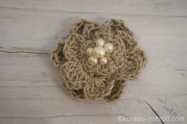 花びら3枚をそれぞれ編み、重ねることによってゴージャスさが増します。